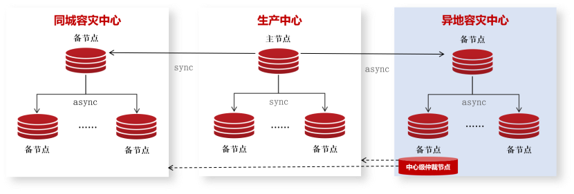系统正常运行时使用生产中心,而当生产中心出现全局故障后,同城灾备中心自动切换为主节点对外提供服务,主节点下挂节点自动切换为同步模式。当同城灾备中心作为灾备中心使用时,数据库属于只读模式,同城灾备中心与生产中心同步节点可参与实时性高的读请求对外提供服务,下挂的两个备节点可承担非实时性查询类业务(报表类、数据导入导出等日常业务)数据需要。