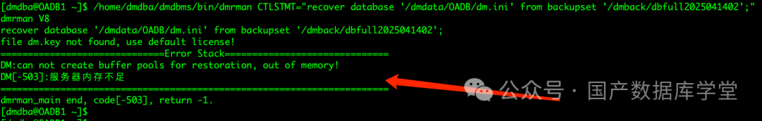 在达梦数据库(DM8)执行备份恢复操作时,出现服务器内存不足错误: