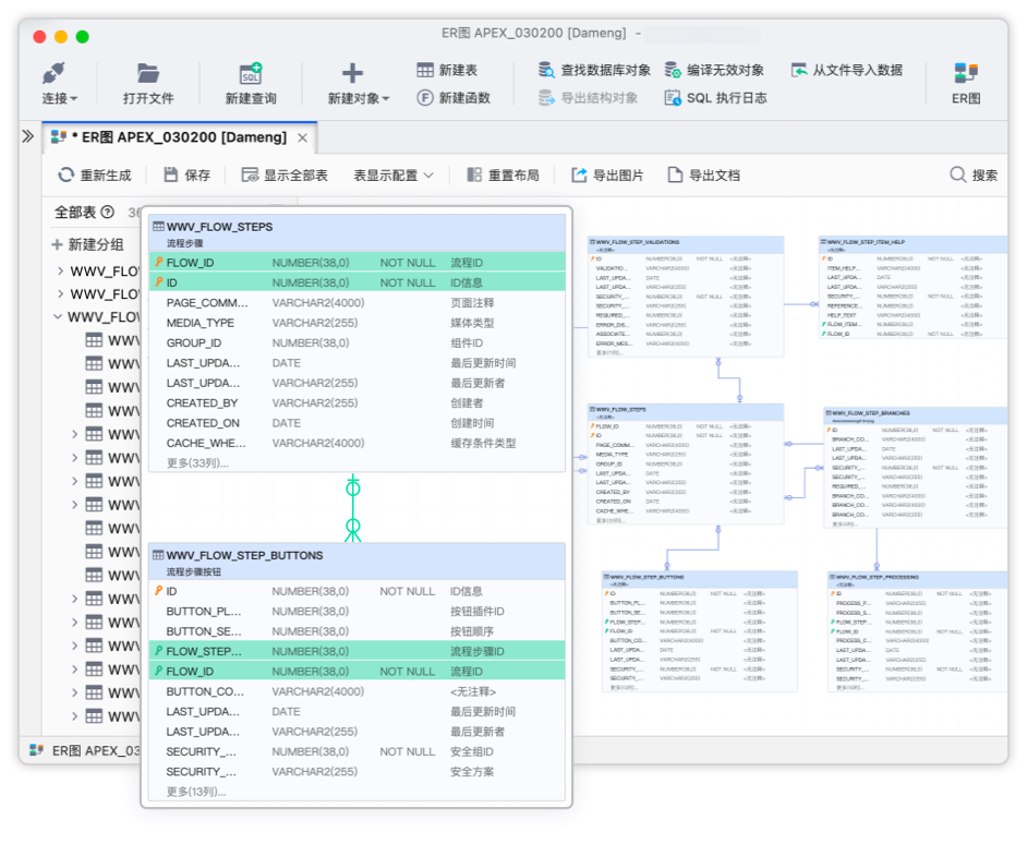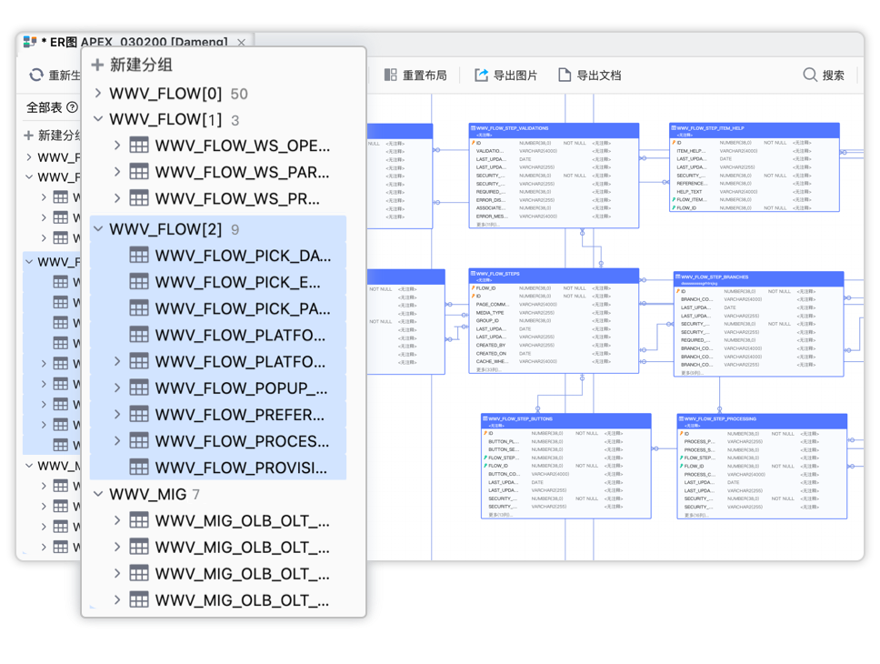 从事企业软件项目开发的同学们对 ER 图一定很熟悉,可以帮助用户快速厘清数据库结构,方便后续维护和优化。SQLark 的 ER 图功能支持达梦数据库、Oracle、MySQL,还提供智能分组、导出设计文档等特色功能。