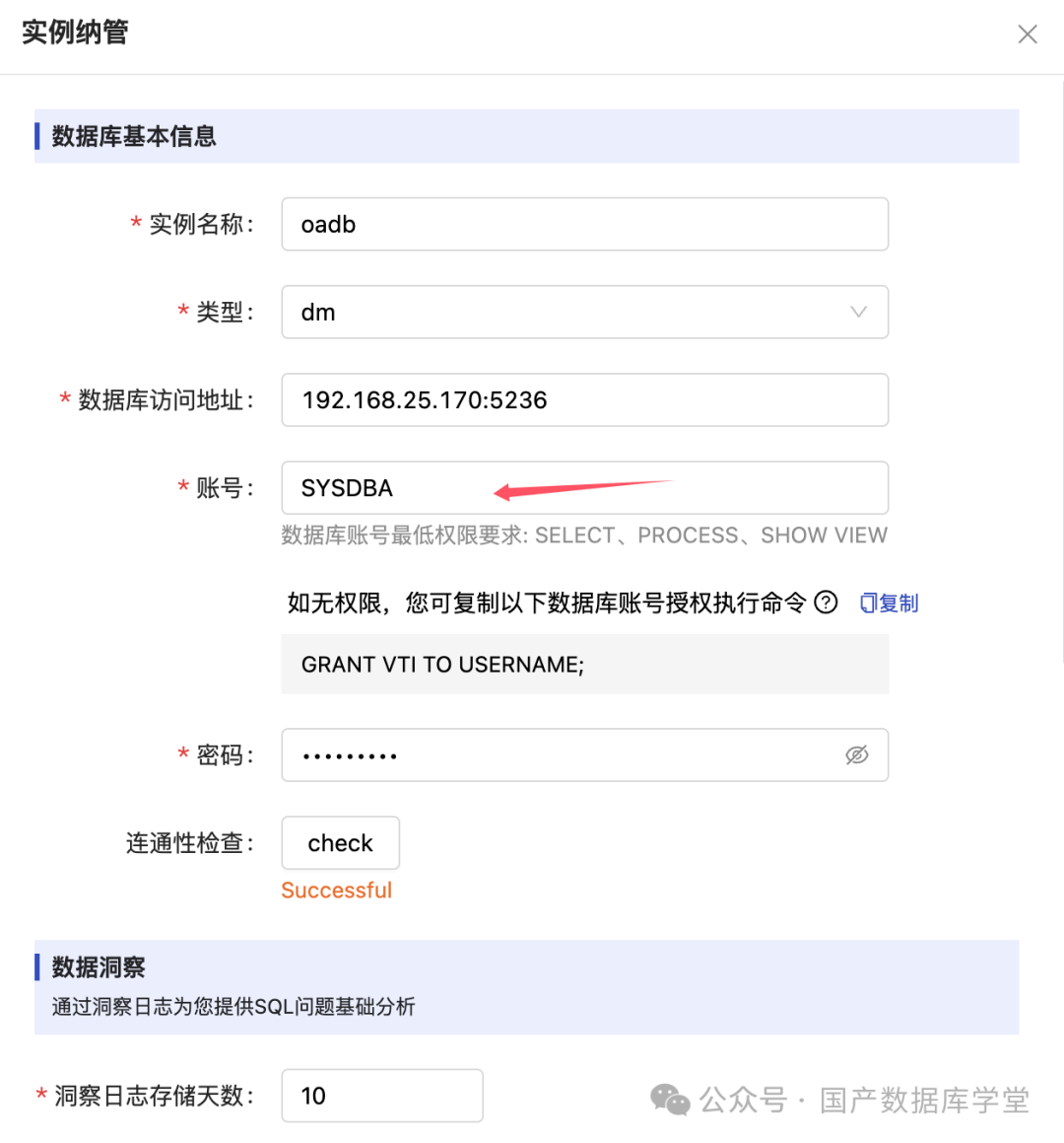 目前纳管达梦实例不支持自动纳管集群,只能单个添加纳管,这里以SYSDBA用户为例填写帐号信息,示例如下: