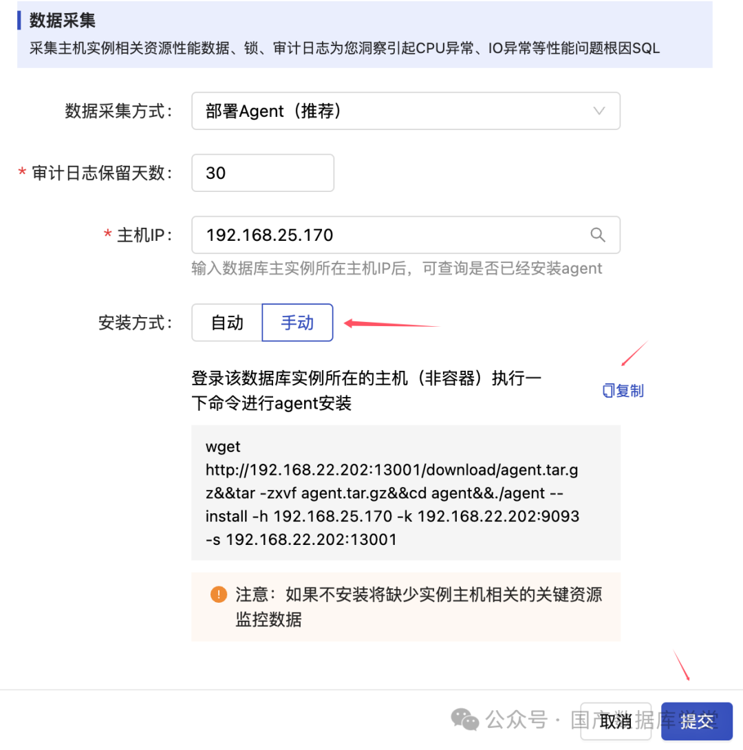 ◦ 手工部署方式:若选择手工部署,复制命令到对应的服务器执行安装。示例如下: