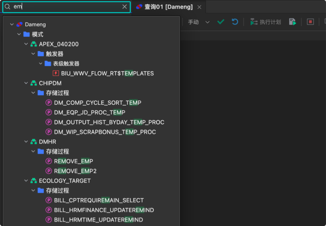 当用户只知道对象名,但是不确定在哪个数据库/模式里,或者不确定该对象是表、视图或其它对象时,可以直接在导航树的对象查找器进行快速查找。该搜索支持模糊匹配,搜索范围是所有已连接的数据库,搜索结果按照对象类别进行展示,并可定位至该对象所在位置。