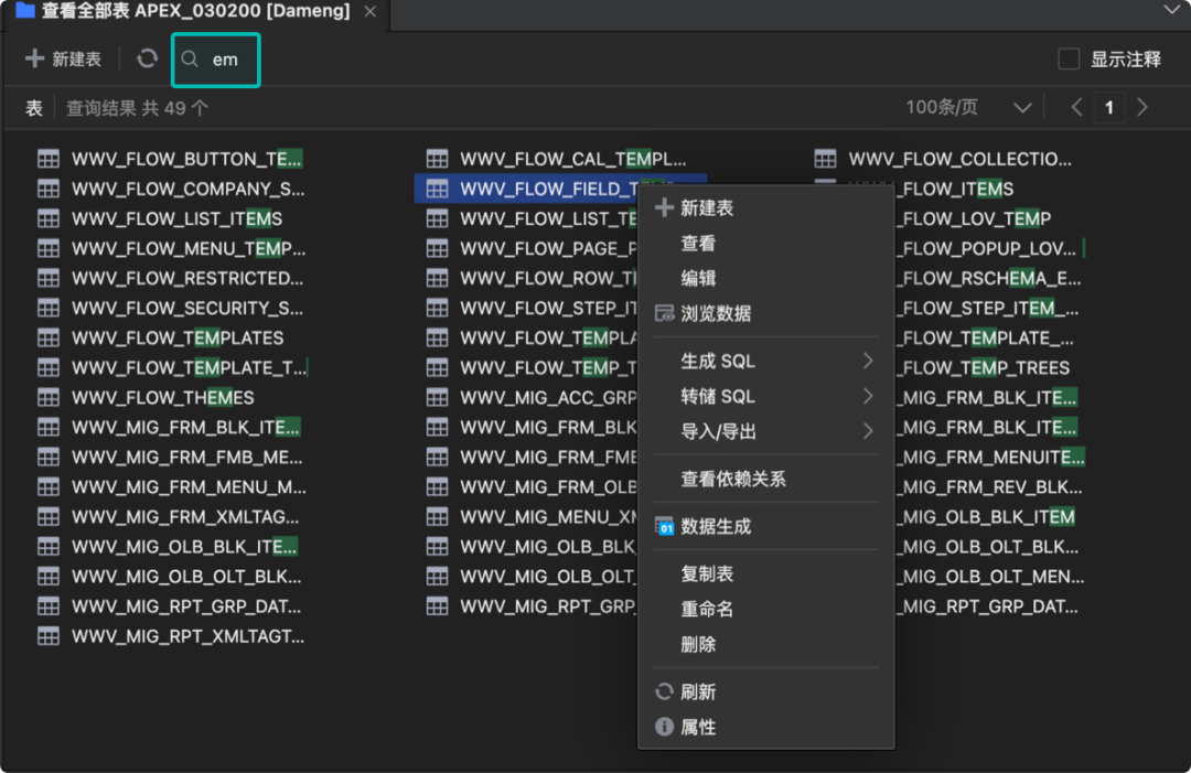 当用户知道该对象在哪个库/模式下时,可以在“查看全部对象”窗口中搜索。例如在“查看全部表”窗口中搜索表,该页面采用分页展示,即使十万数量级的对象也不会发生卡顿。对于搜索结果可以直接右键进行修改、导入导出等操作。