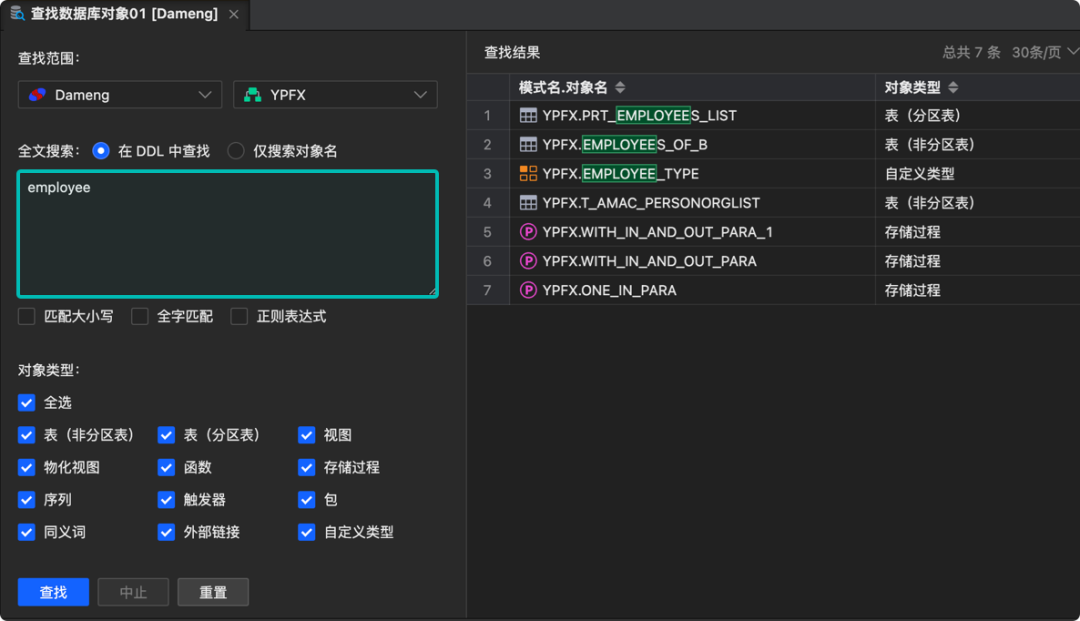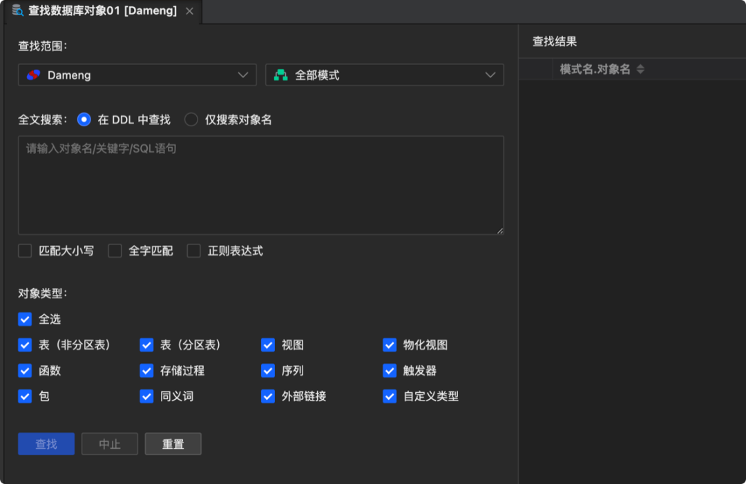 SQLark 的“查找数据库对象”功能,不仅能对数据库对象名进行查找,还支持通过搜索对象 DDL 代码来查找数据库对象。在迁移、跑批等测试时,可以通过错误信息中的对象名、一段代码或中文字符串,来迅速定位相关对象。