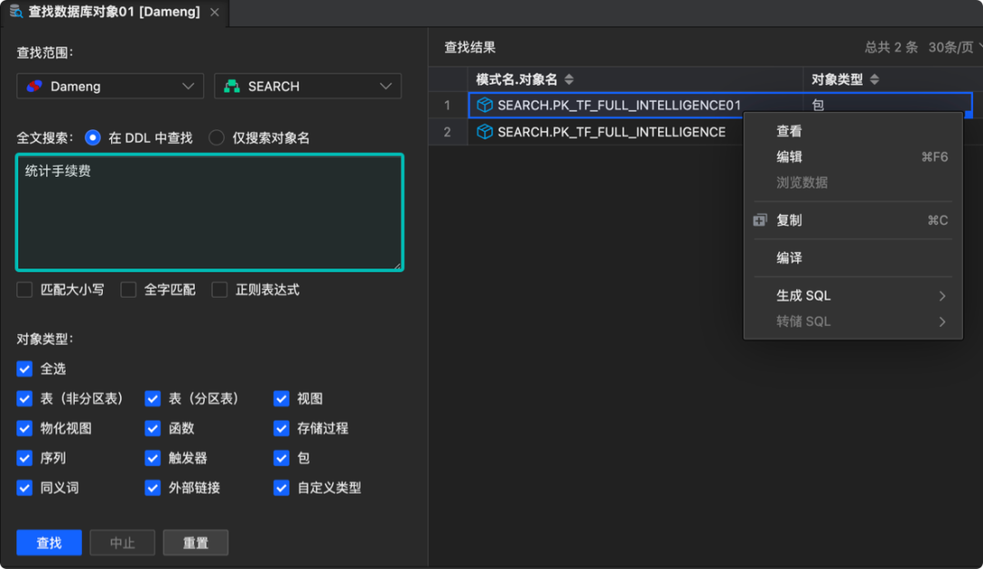 搜索后可以看到 SEARCH.PK_TF_FULL_INTELLIGENCE、SEARCH.PK_TF_FULL_INTELLIGENCE01 两个包涉及到统计手续费相关业务;通过右键菜单操作,即可跳转到对象详情页面进一步分析。