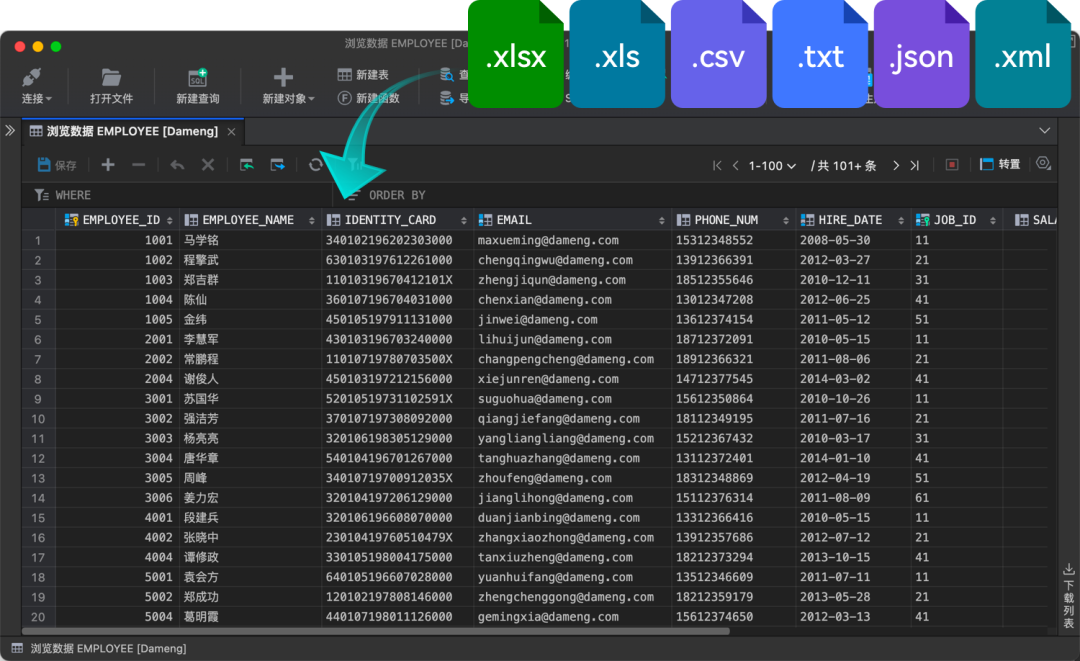 SQLark 提供完整的从外部文件导入数据的功能,通过文件识别与解析、列名智能映射等步骤,支持将 xlsx、xls、csv、txt、json、xml 文件的数据导入至数据库的目标表。