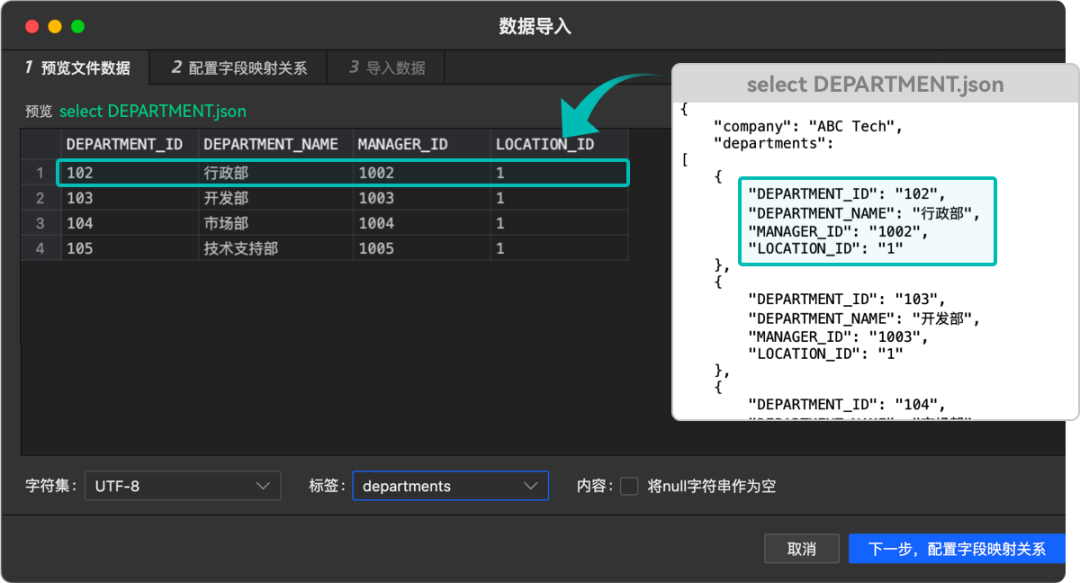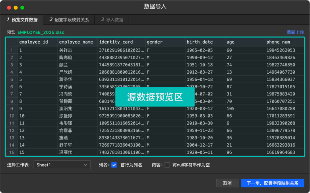 SQLark 自动识别和解析上传的文件,以表格形式提供源文件数据预览,用户可以方便的核对有没有乱码、特殊字符、重复数据等异常情况,确保后续导入数据的正确性。