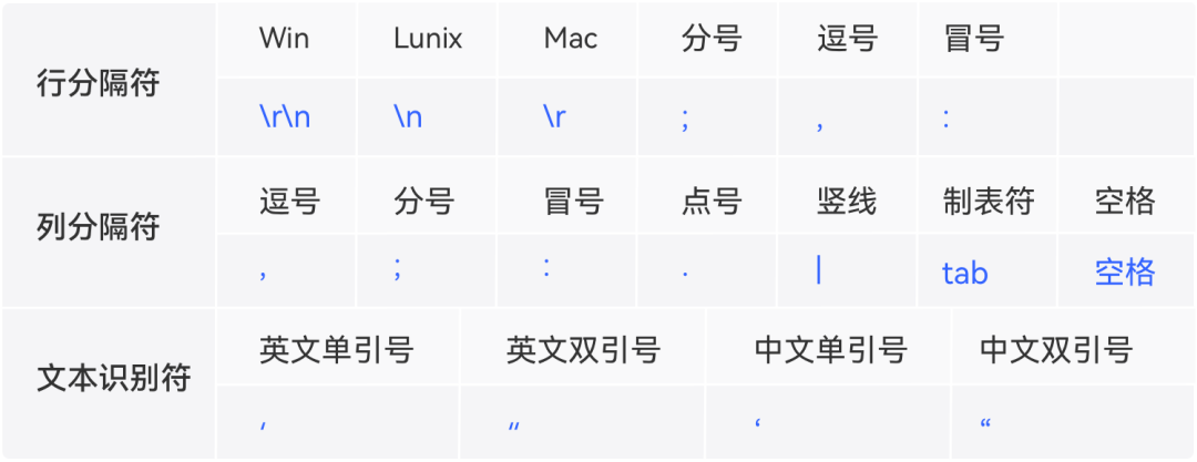 分隔符:SQLark 自动识别常见的行分隔符、列分隔符和文本识别符: