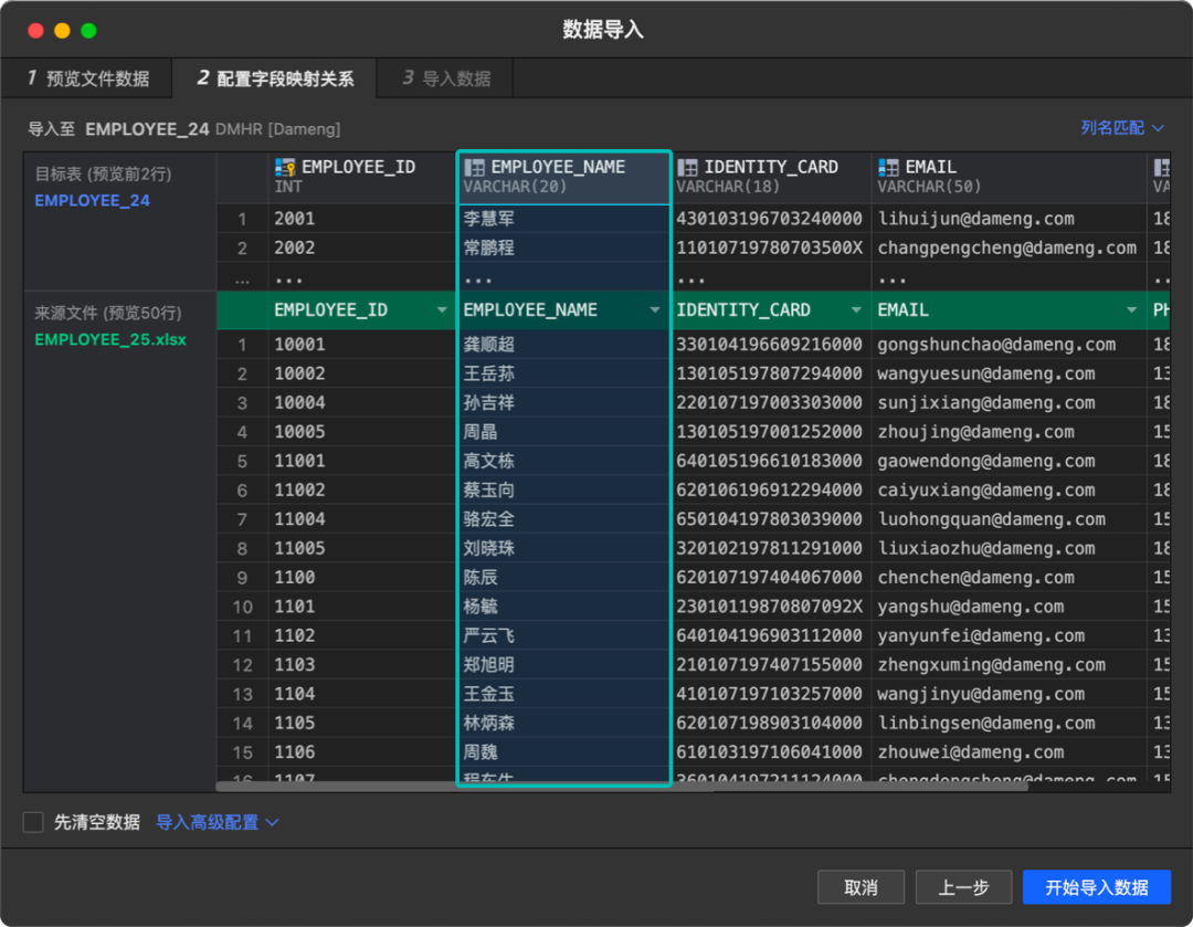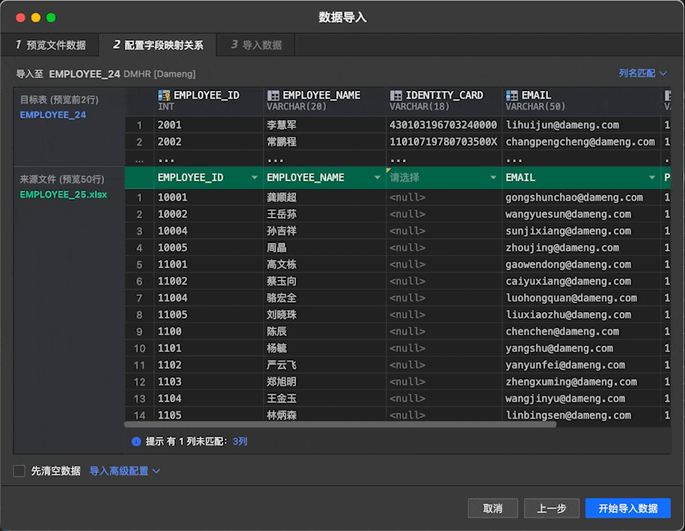 用户可以通过 SQLark 提供的“所见即所得”的列映射页面,快速核对列是否匹配正确。列映射页面采集了目标表的前 2 行数据,和文件的前 50 行数据进行对比展示,用户通过数据内容即可一目了然(如下图👇)