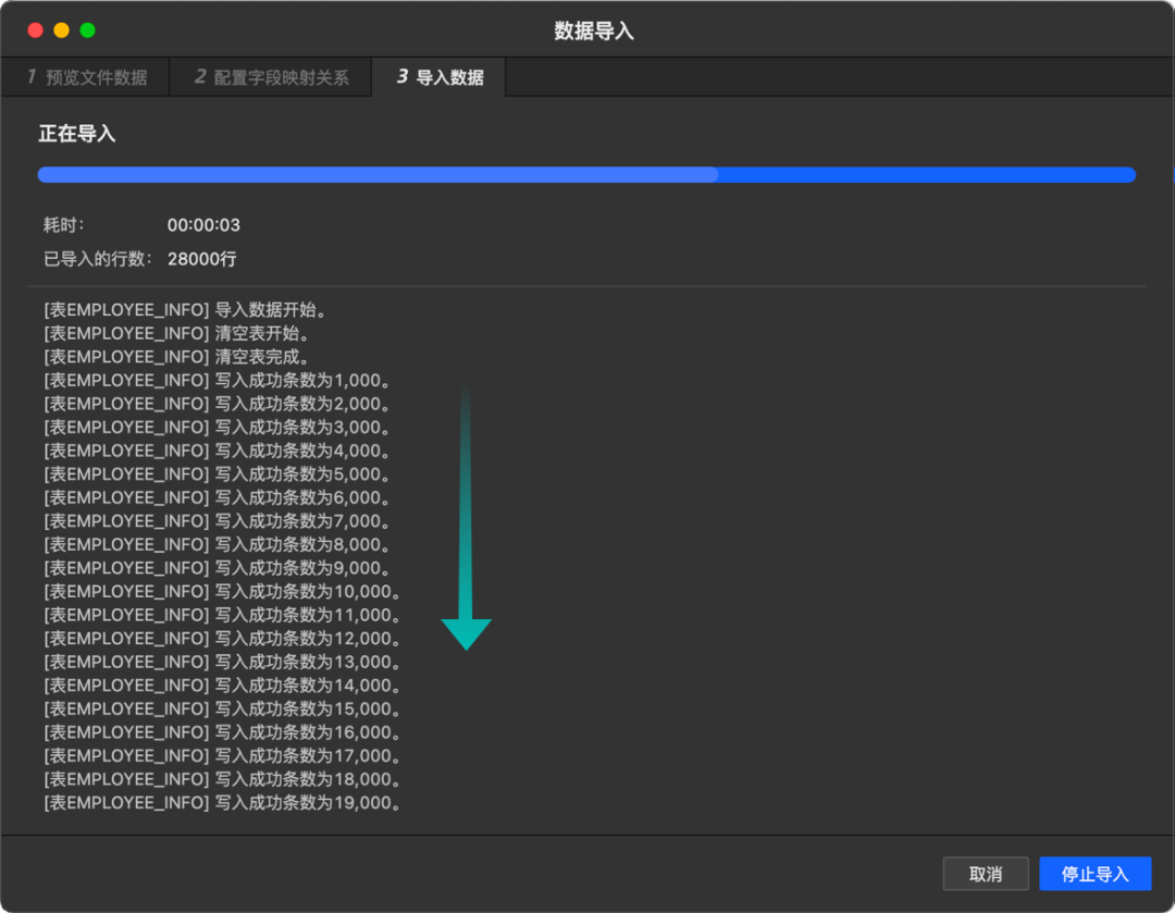导入过程中,可以看到实时日志,掌握导入进度,对于导入异常的情况,也可以根据日志信息及时调整。