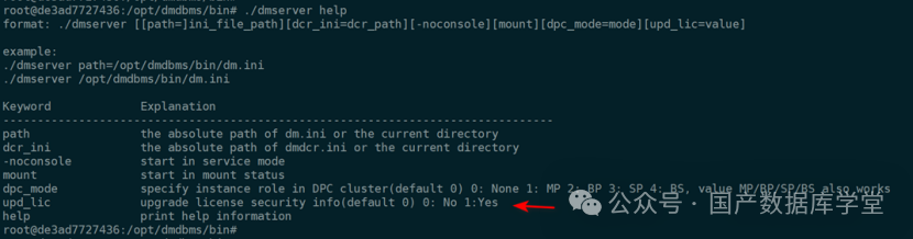 root@de3ad7727436:/opt/dmdbms/bin# ./dmserver help
