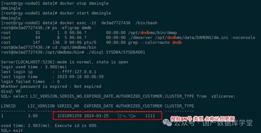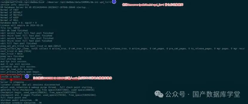 执行./dmserver opt/dmdbms/data/DAMENG/dm.ini upd_lic=1