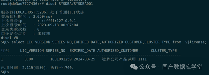 root@de3ad7727436:/opt/dmdbms/bin# ./disql SYSDBA/SYSDBA001