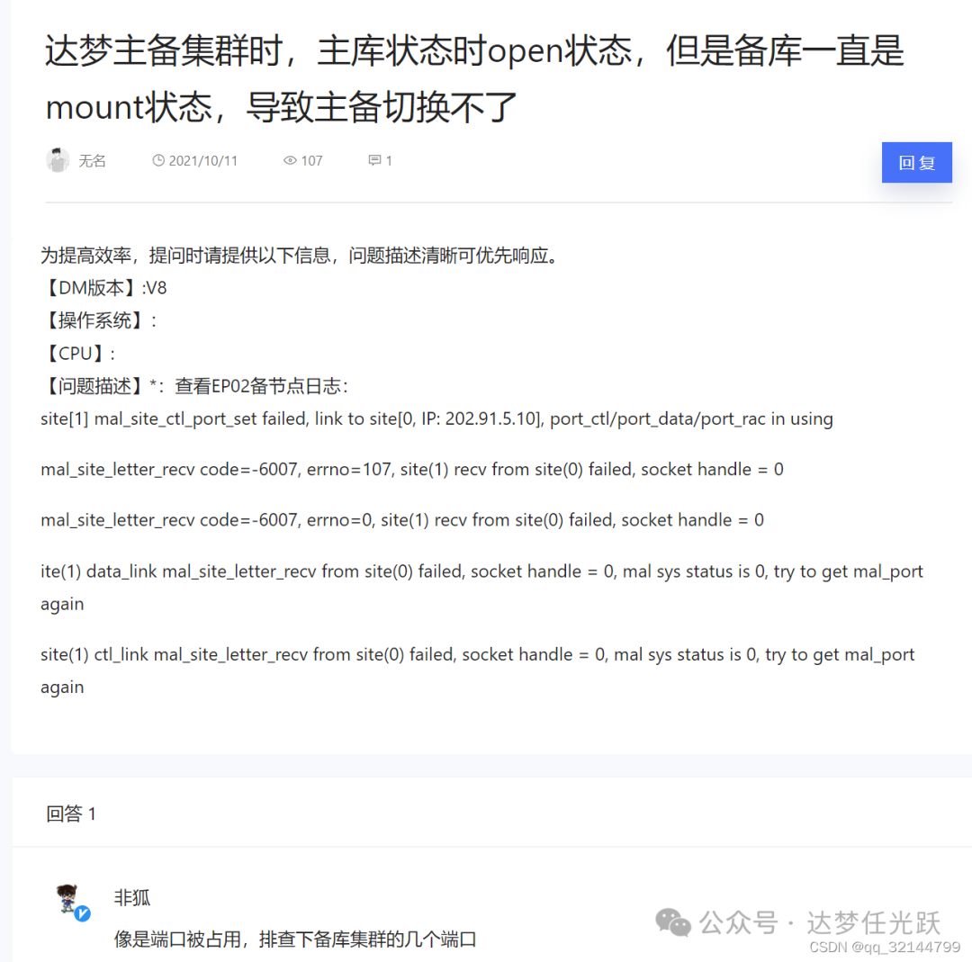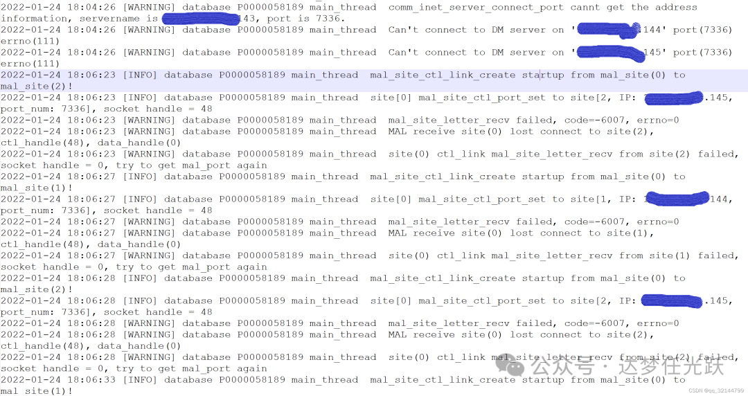 数据库日志如图: 当时参考了下这为小伙伴的帖子说,端口可能冲突 解决: 根据日志文件提示mal_site_letter_recv failed, code=-6007, errno=0, port 7336 为集群MAL_PORT的端口,排查服务器发现有台服务器端口占用,修改端口号之后,重启集群数据同步正常