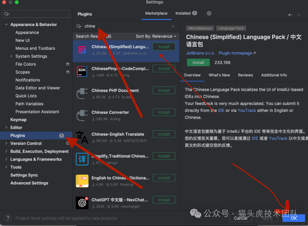 选项。在插件市场中搜索 “Chinese (Simplified) Language Pack” 或者 “中文插件”,然后点击安装。