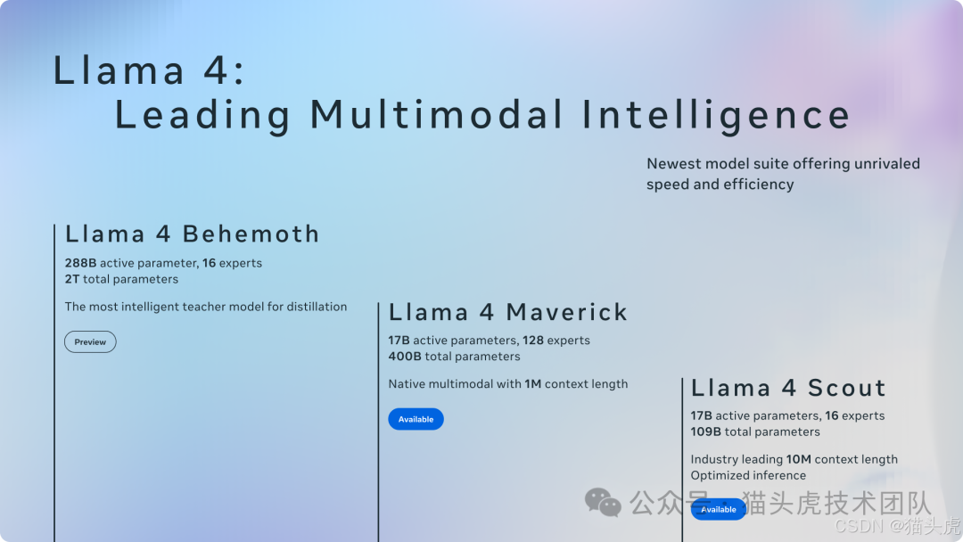 Meta 在 2025 年 4 月 5 日正式推出了其 Llama 4 系列 AI 模型,标志着原生多模态智能 AI 的新纪元。Llama 4 系列包括三个主要模型:Llama 4 Scout、Llama 4 Maverick 和 Llama 4 Behemoth。这些模型不仅代表了 Meta 在多模态 AI 领域的最新突破,同时也为开发者和企业提供了强大、开放且具有极高效率的 AI 工具。本文将详细分析 Llama 4 系列的技术创新、架构设计、训练方法、参数配置等方面的内容。
