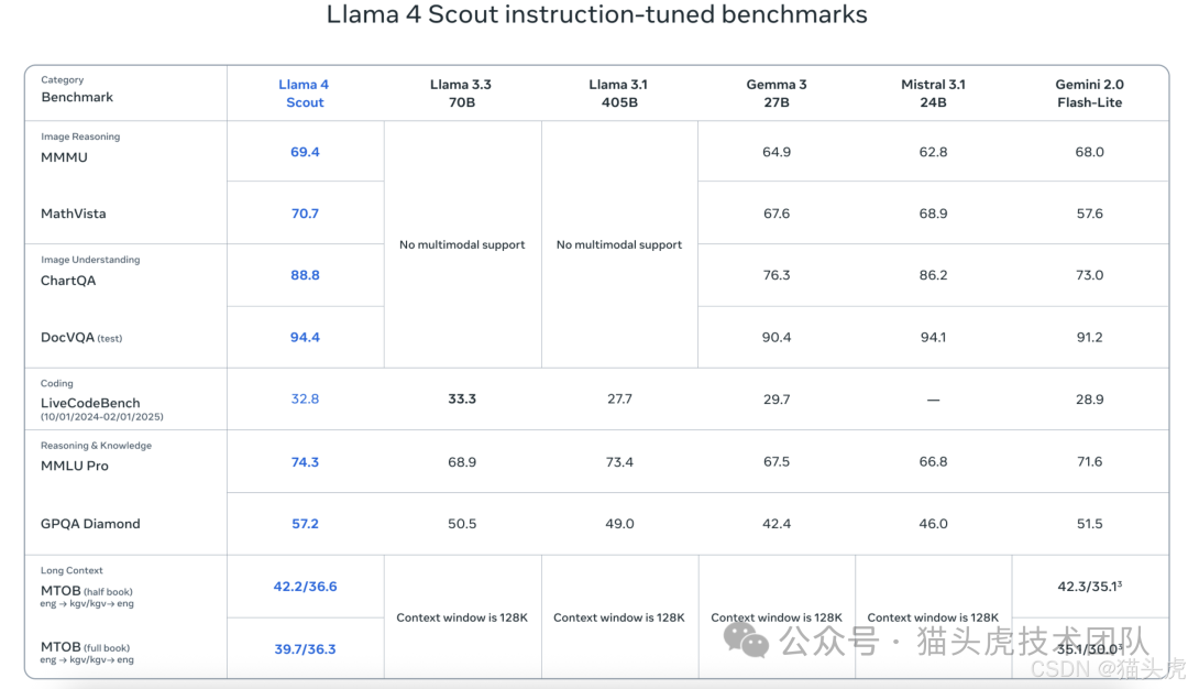 活跃参数:17 亿个 专家模型数量:16 个专家 总参数:1090 亿个 上下文窗口:10M tokens(相比 Llama 3 的 128K tokens,大大提升了上下文处理能力) GPU 支持:支持单个 NVIDIA H100 GPU(通过 Int4 量化)
