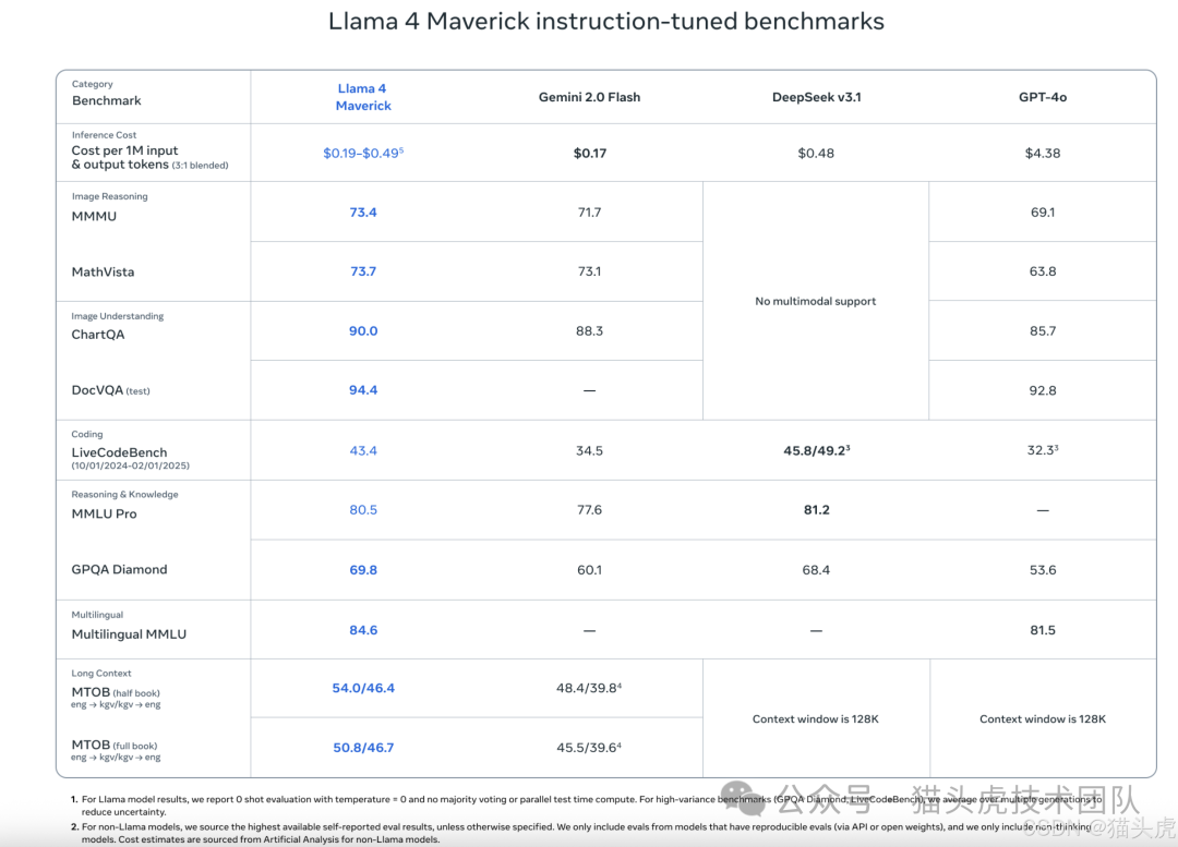 活跃参数:17 亿个 专家模型数量:128 个专家 总参数:4000 亿个 上下文窗口:同样支持扩展至 10M tokens 性能对比:在多个基准测试中,Llama 4 Maverick 超越了 GPT-4o 和 Gemini 2.0 Flash,特别是在推理、编程和多语言任务上表现突出。