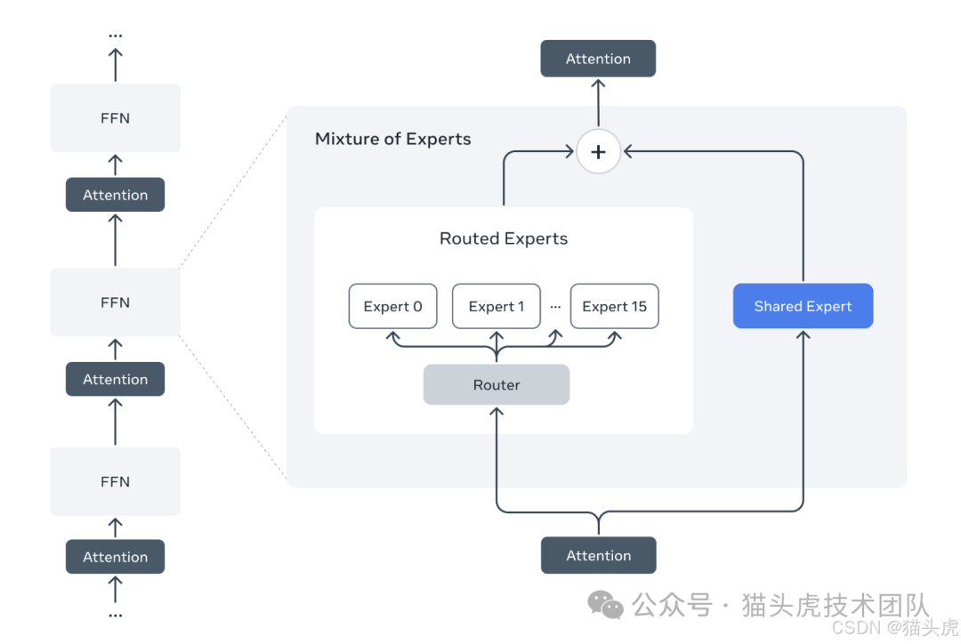 混合专家架构(MoE):Llama 4 系列采用了混合专家架构,这种架构能在计算效率和质量上提供显著优势。模型中的每个 token 只会激活一部分专家模型,而不是整个模型的参数,这样能够显著减少计算负担,并且在有限的计算资源下提供更高的性能。