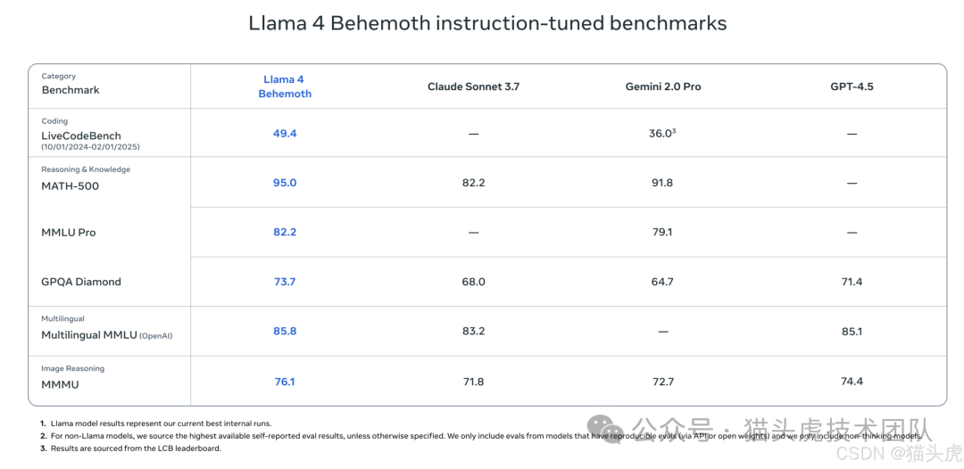活跃参数:2880 亿个 专家模型数量:16 个专家 总参数:2 万亿个 性能对比:Llama 4 Behemoth 在多个 STEM 基准测试中超越了 GPT-4.5、Claude Sonnet 3.7 和 Gemini 2.0 Pro,特别是在数学、推理和多语言理解方面。