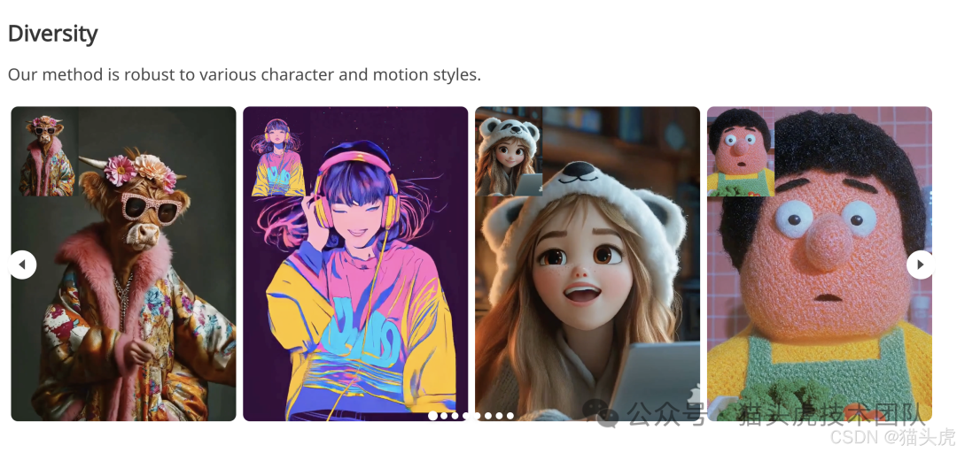 这项技术的突破点在于其能够实现面部表情和身体动作的精细控制,无论是微笑、眨眼、嘴唇颤动,还是头部的转动、手臂的抬起甚至是复杂的舞蹈动作,都能做到精准复刻。同时,系统还能适应不同的图像尺度和姿势,无论是人物的肖像特写,还是全身动态,都能够无缝过渡。