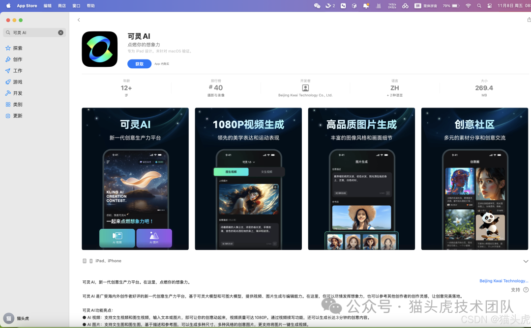 大家好,我是猫头虎 👋,今天为大家带来一则激动人心的消息——快手公司最新推出的AI创意应用“可灵 AI”现已正式登陆苹果 App Store!这款应用不仅能够生成引人入胜的AI视频和图片,更为创作者提供了前所未有的掌上创意体验。📱🎨接下来,就让我们深入了解这款应用如何在AI领域掀起一股新的创作风潮吧!🚀