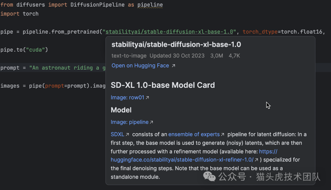 直接在 PyCharm 内部,快速获取您所使用的任何 Hugging Face 模型或数据集的详细信息。简单将鼠标悬停在任何数据集或模型名称上,即可在弹出窗口预览相关说明;或者按下 F1 键,在编辑器旁开启 Documentation(文档)工具窗口深入了解。更便捷地,通过 ⌘Click(在 Windows 和 Linux 上为 Ctrl+点击)直接导航至 Hugging Face 官网文档。