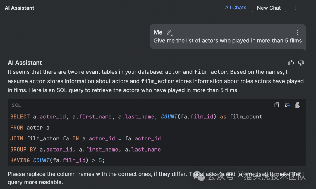 借助 AI Assistant,不仅可以获取对查询响应的架构感知型解释,还能根据数据库上下文快速生成结构化 SQL 查询。这一功能通过智能搜索支持您在数据库内部直接生成并执行查询,大幅提升数据库操作的准确性和速度。
