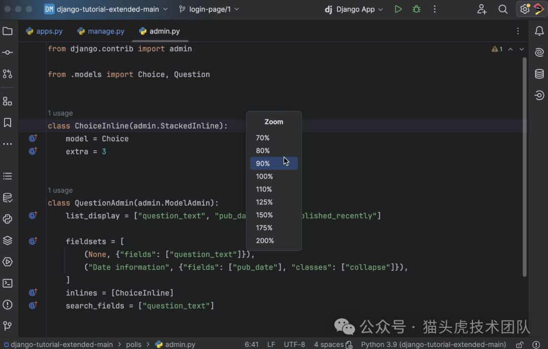 为了更好地适应不同用户的视觉需求和屏幕尺寸,PyCharm 新增了界面缩放功能。您现在可以选择将整个 IDE 的显示比例调整为 90%、80% 或 70%,从而灵活控制界面元素的大小。这一改进不仅提升了软件的可访问性,也使得在不同分辨率的显示设备上工作更为便捷和舒适。
