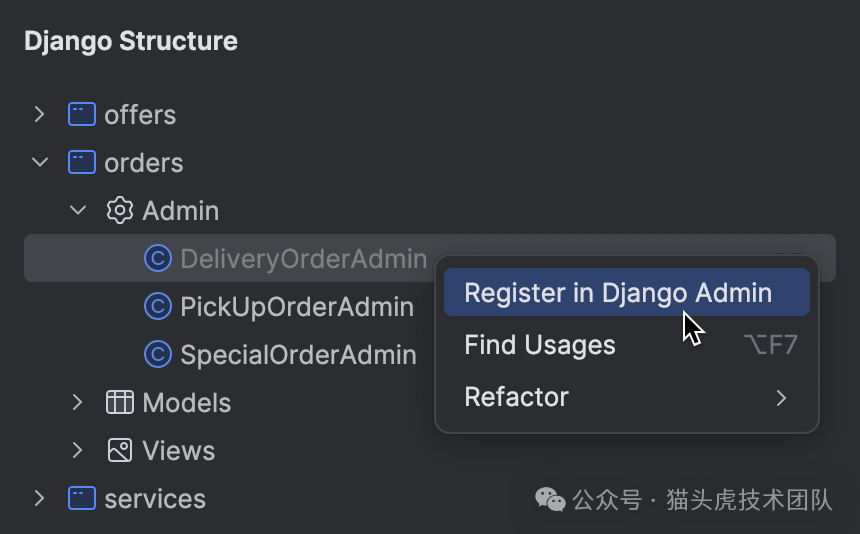 PyCharm 2024.1 版本让 Django 开发更加高效。现在,您可以在 Django Structure(Django 结构)工具窗口中快速检查并一键注册未注册的 admin 类,这一改进显著简化了 Django 管理界面的配置过程。