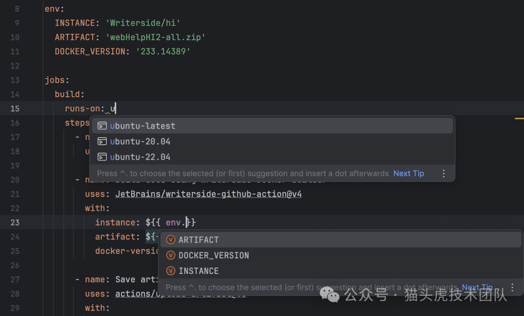 ),以及 YAML 结构自动补全,确保工作流脚本的准确性。此外,新增的 Docker 镜像和 JavaScript 文件路径补全功能简化了容器和操作的集成。
