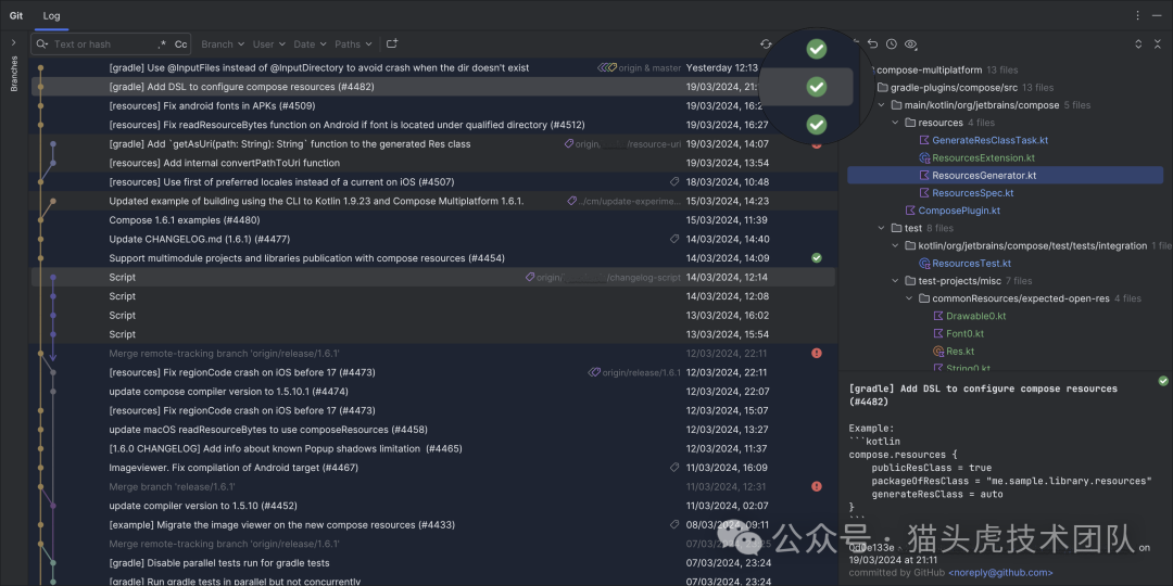 在 Git 工具窗口的 Log(日志)标签页中,我们引入了一个新的列,使您可以轻松查看 CI 系统对 GitHub 提交的检查结果。此功能让您及时了解代码状态,保障代码质量与流程的顺畅。