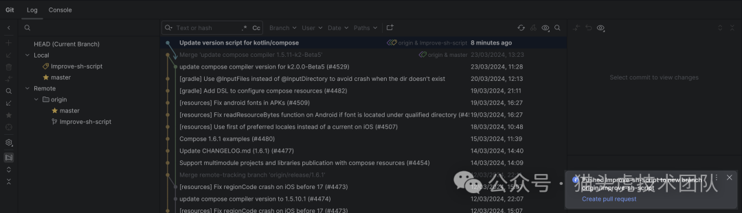 成功将更改推送到版本控制系统后,PyCharm 会立即发布通知,提示成功推送并建议您创建拉取/合并请求。这一集成提高了工作流的连贯性和效率。