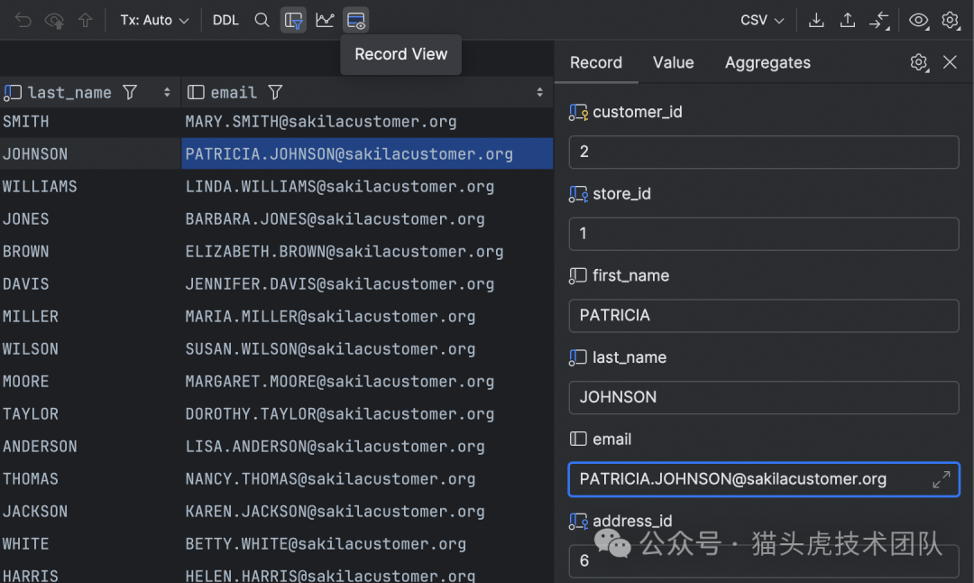 在数据编辑器中,新增的单记录视图让您可以专注于单独一条记录的详细信息。使用 ⌘⇧Enter(在 Windows/Linux 上为 Ctrl+Shift+Enter)快捷键或点击工具栏的 Show Record View(显示记录视图)按钮,即可开启这一视图。它包括一个侧面板,显示值编辑器和聚合视图,如果单元在主网格中可编辑,在记录视图中同样可编辑。