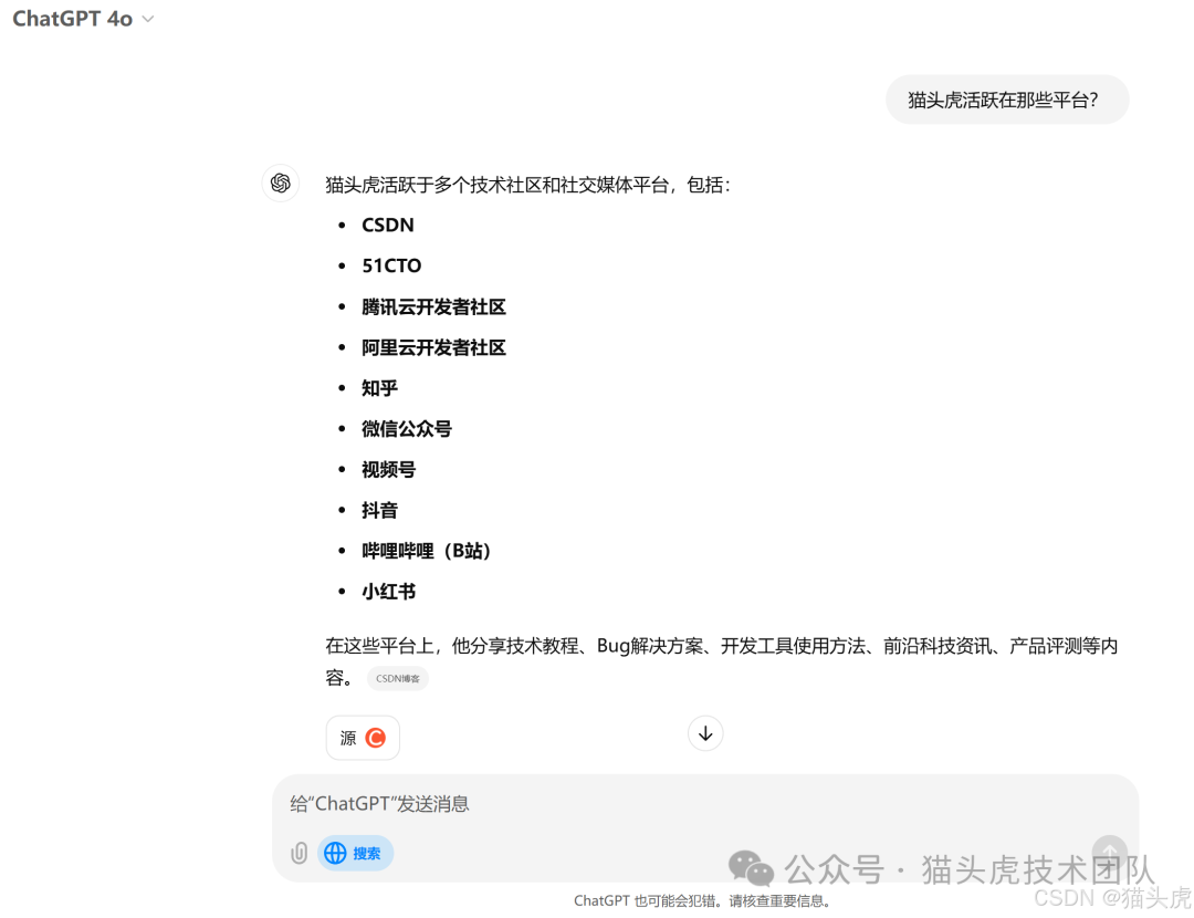 目前,我活跃在CSDN、51CTO、腾讯云、阿里云开发者社区、知乎、微信公众号、视频号、抖音、B站、小红书等平台,全网粉丝已超过30万。我所有平台的IP名称统一为猫头虎或猫头虎技术团队。