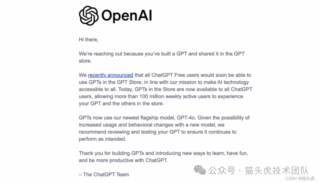 大家好,我是猫头虎,今天要和大家分享一个振奋人心的消息:所有 ChatGPT 免费用户现在可以使用 GPT 商店中的 GPT 了!这真的是一个巨大的突破,让我们一起来看看这个激动人心的时刻吧。