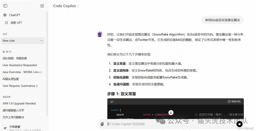 好的,让我们开始实现雪花算法(Snowflake Algorithm)在Go语言中的代码。雪花算法是一种分布式唯一ID生成算法,由Twitter开发。它生成的ID是64位的整数,保证了分布式系统中唯一性和有序性。