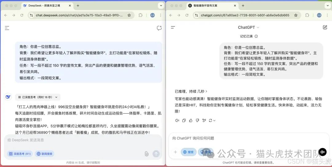 DeepSeek:一向以高效的信息检索和精准推理分析能力见长;再加上其 “低成本+开源策略” 的优势,能让更多行业和研究机构进行针对性的优化和二次开发。 ChatGPT:具备多领域、多场景下的语言理解和对话能力,在需要高互动性、创意性的场景中表现优异,不过在非常严谨的逻辑推理时,依然会出现一定程度的错误或不准确。
