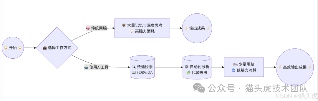 记忆力退化:过于依赖搜索与大模型输出使大脑产生了惰性,导致不再主动储备知识; 专注力下降:当面对海量零碎且超出AI能够处理范围时,信息轰炸让我们的大脑难以进行深度思考, 频繁地脑力透支,导致在做关键分析判断时出错; 推理力下降:过于依赖AI解决问题,大脑缺乏推理场景的运用,导致我们的大脑在独自进行推理演算的过程中反复卡顿 ; 学习能力削弱:研究表明,习惯“拿来主义”式的学习模式,容易让我们对原理和方法的深入理解变得浮于表面。