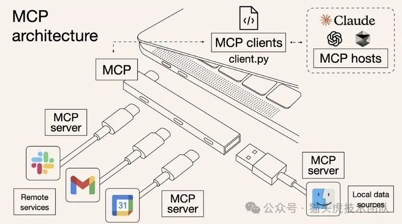 MCP 的技术架构可以类比为计算机上的“USB-C 集线器”。USB-C 接口能够让不同的设备通过统一的接口进行连接,MCP 则为 AI 模型与外部数据源和工具提供了类似的通道。