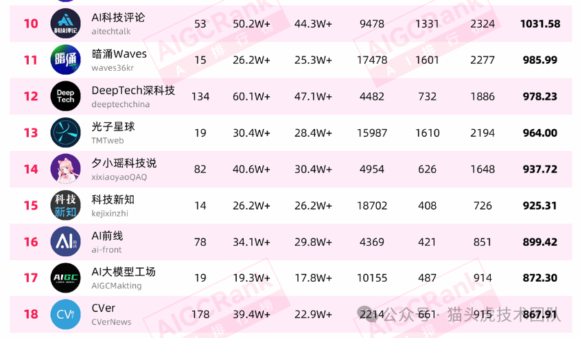 大家好,我是猫头虎!最新的AIGCRank AI行业微信公众号排行榜已经出炉了。如果大家觉得一个一个去搜索太麻烦,没关系,我帮大家整理到了本文,今天先整理前Top50个公众号,方便大家关注。