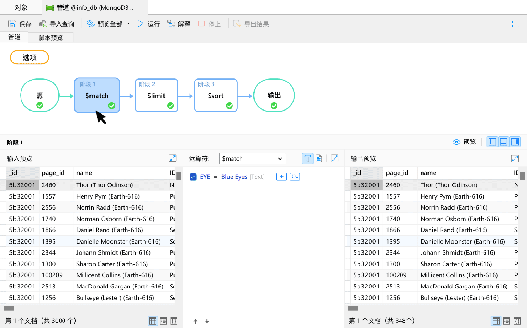 通过清晰且响应迅速的 UI 逐步构建聚合管道。你可以使用拖放功能来添加和重新排列阶段,以实现所需的数据流。通过此可视化界面,你可以跟踪每个阶段的数据流。它提供管道不同阶段的即时反馈和结果预览。Navicat 使你能够验证数据转换的准确性和正确性,并对管道微调以获得最佳性能。
