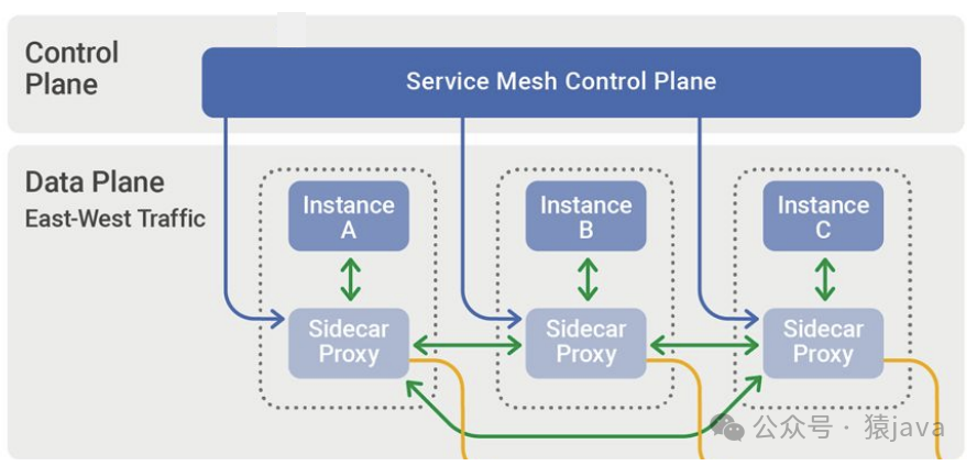 如下图:Instance A,Instance B,Instance C之间不直接通信,而是通过服务旁边对应的 SideCar Proxy间接通信。