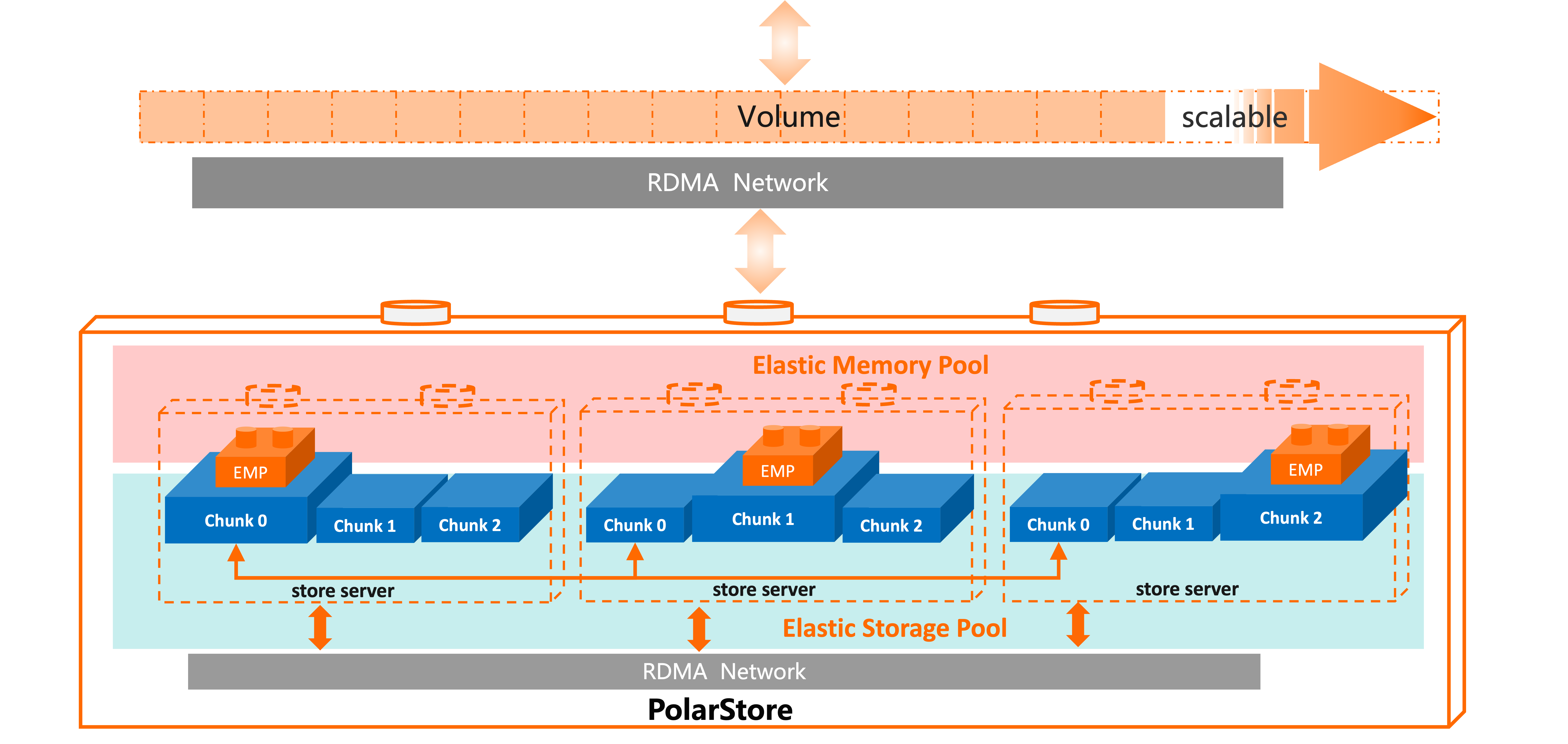 PolarDB使用的存储层是PolarStore提供的Volume,每个Volume被分成多个Chunk,Chunk分布在不同的节点上,每个Chunk维护三个副本,三个副本分别在不同的存储节点上。计算节点上部署PolarSwitch 服务,可以转发数据库的I/O请求,计算节点和存储节点之间通过高速网络RDMA互联,计算节点可以和若干的存储节点互联,因此PolarStore提供的分布式存储可以弹性的扩展和缩小。每个存储节点上包含的高速介质空间有限,但EMP是在存储集群上实现的,是集群级别的内存池,同时拥有分部署存储的弹性能力,可以给单个PolarDB集群提供非常大的缓存空间。