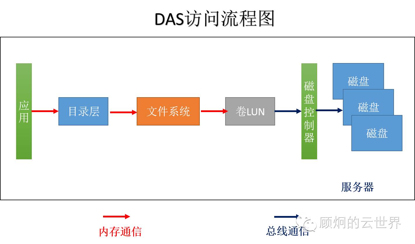 不管是DAS、NAS还是SAN,数据访问的流程都是差不多的。DAS将计算、存储能力一把抓,封装在一个服务器里。大家日常用的电脑,就是一个DAS系统,如图1。