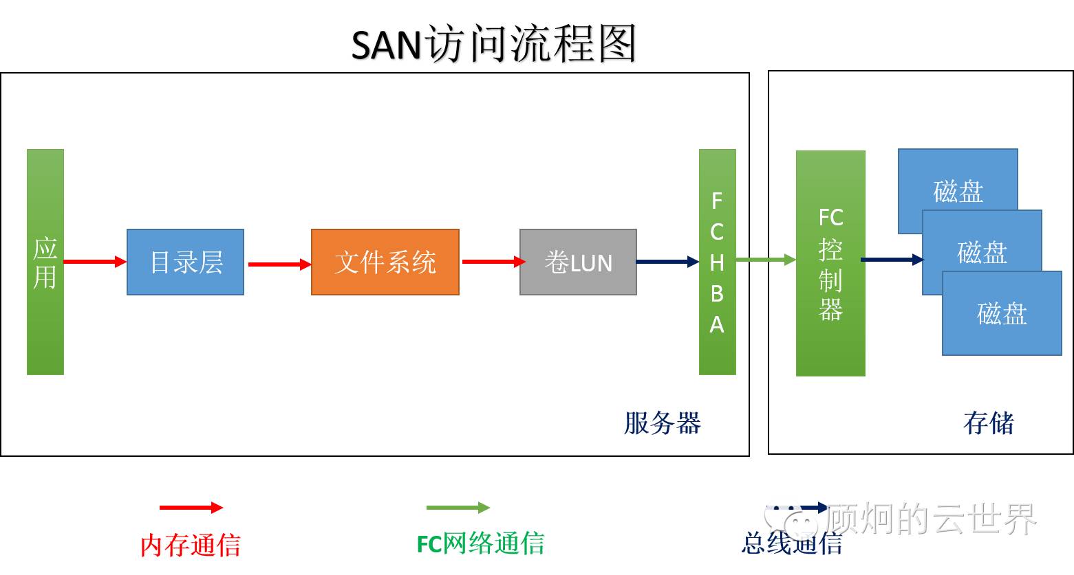 计算和存储分离了,存储成为一个独立的设备,存储只是接受命令不再做复杂的计算,只干读取或者写入文件2件事情,叫SAN,如图3。因为不带文件系统,所以也叫“裸存储”,有些应用就需要裸设备,如数据库。存储只接受简单明了的命令,其他复杂的事情,有服务器端干了。再配合FC网络,这种存储数据读取/写入的速度很高。但是每个服务器都有自己的文件系统进行管理,对于存储来说是不挑食的只要来数据我就存,不需要知道来的是什么,不管是英语还是法语,都忠实记录下来的。但是只有懂英语的才能看懂英语的数据,懂法语的看懂法语的数据。所以,一般服务器和SAN存储区域是一夫一妻制的,SAN的共享性不好。当然,有些装了集群文件系统的主机是可以共享同一个存储区域的。