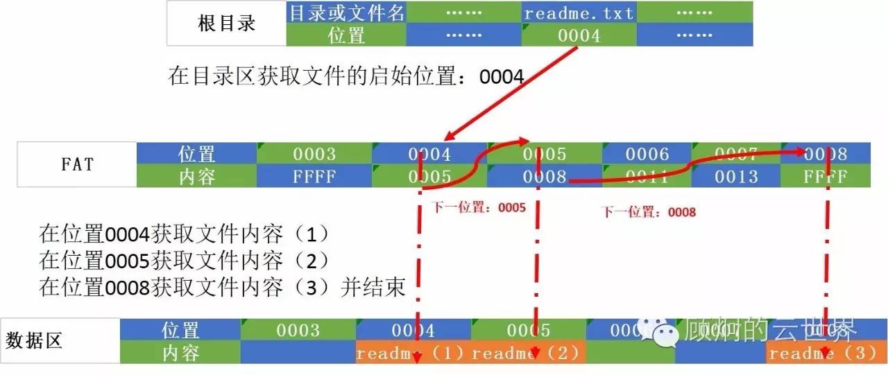 在这个例子中,我们看到在FAT文件系统,是通过查询FAT表和目录项来确定文件的存储位置,文件分布是以簇为单位的数据块,通过“链条”的方式来指示文件数据保存的文字。当要读取文件时,必须从文件头开始读取。这样的方式,读取的效率不高。