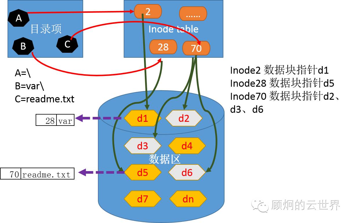 当查看某个目录或文件时,会先从inode table中查出文件属性及数据存放点,再从数据块中读取数据。