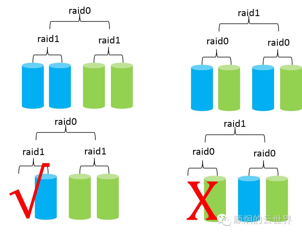 当左边的raid10系统有一块故障,底层数据是做raid1镜像的,数据的完整性没有被破坏,还可以再坏一块另外raid1组的一个磁盘。而raid01,当底层的raid0组的磁盘坏掉一块,整个raid0组数据就无效了,所有的IO都会到剩下的raid0组,并且如果再坏一块盘,整个数据就无效了。
