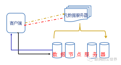 客户端和元数据服务器之间交互是“信令交互”,而客户端到数据节点是“媒体交互”。元数据服务器或通过数据节点服务器获取各节点服务器的基本配置情况和状态信息。